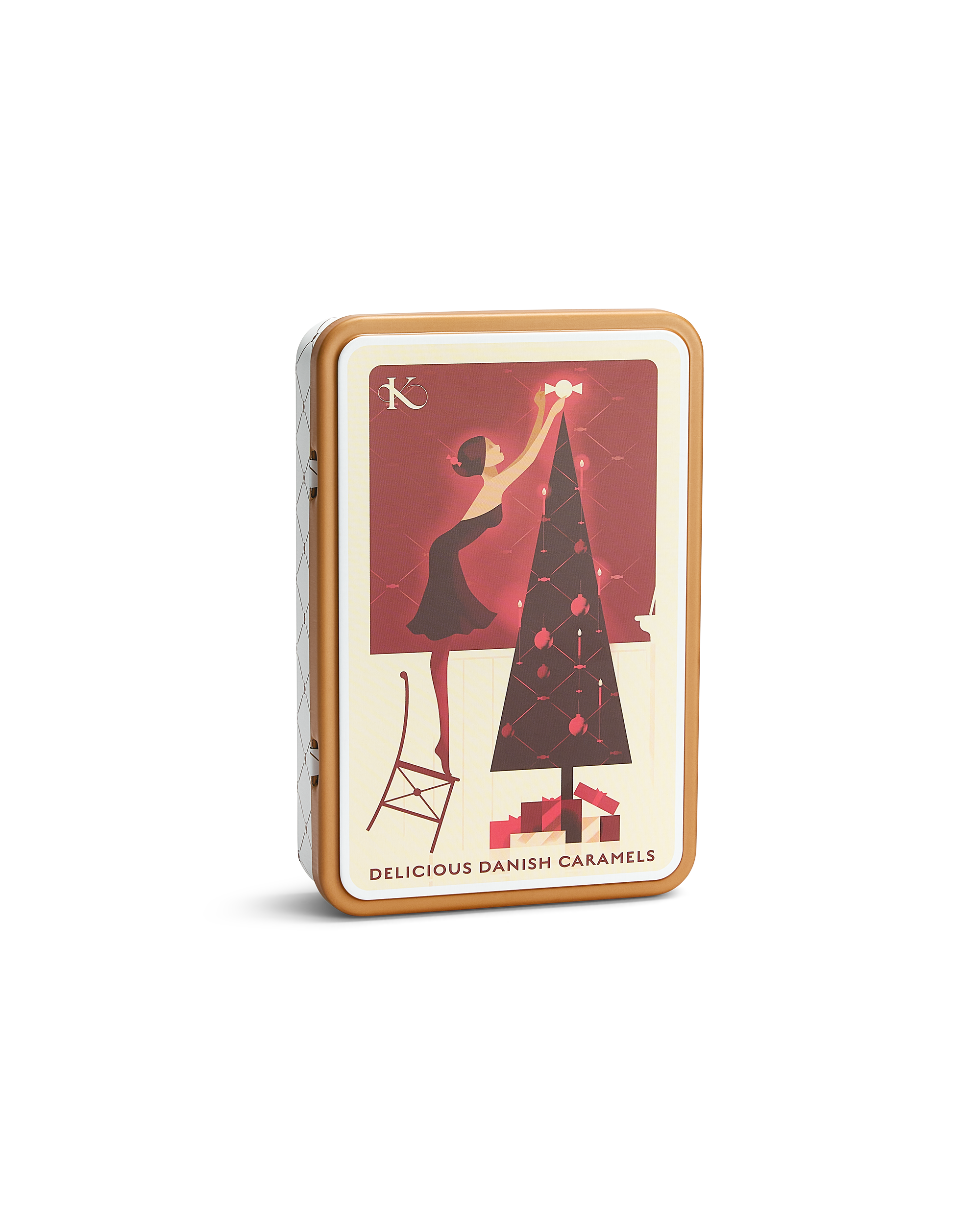 Den danske illustrator Mads Berg står bag den stemningsfulde illustration "Juledag", som pryder denne smukke metaldåse – fyldt med 236g håndlavede julekarameller fra Bornholm. En gave, der både taler til øjet og smagsløgene.