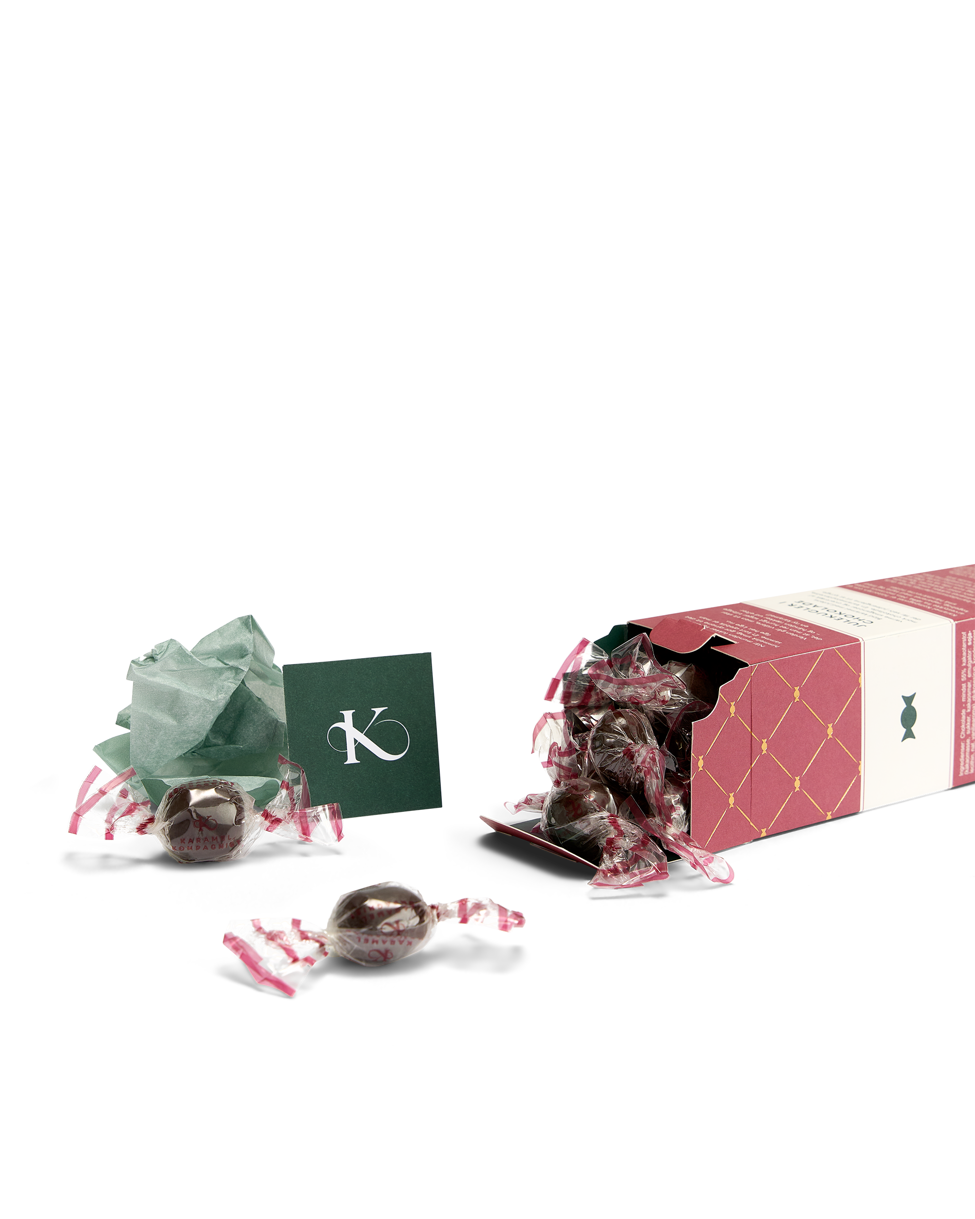 Blød karamel med julens varme smagsnoter og overtræk af mørk chokolade. En karameloplevelse, der får juleenglene til at synge.