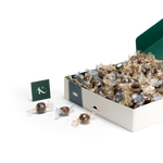 Unsere neuen Boxen sind plastikfrei und bestehen aus FSC-zertifizierten Materialien. Die Karamellbonbons sind in kompostierbares Zellophan mit OK Compost Home-Zertifizierung eingewickelt. Denken Sie daran, Ihren Müll entsprechend den örtlichen Bestimmungen zu trennen.